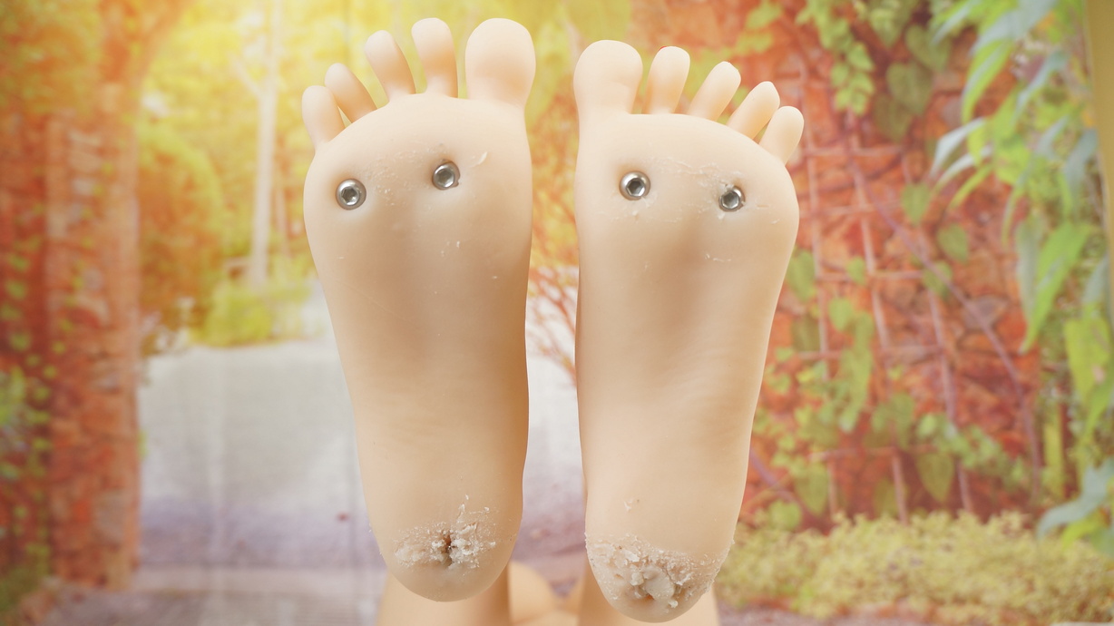 ・両足裏にほつれと亀裂(補修済み)-
