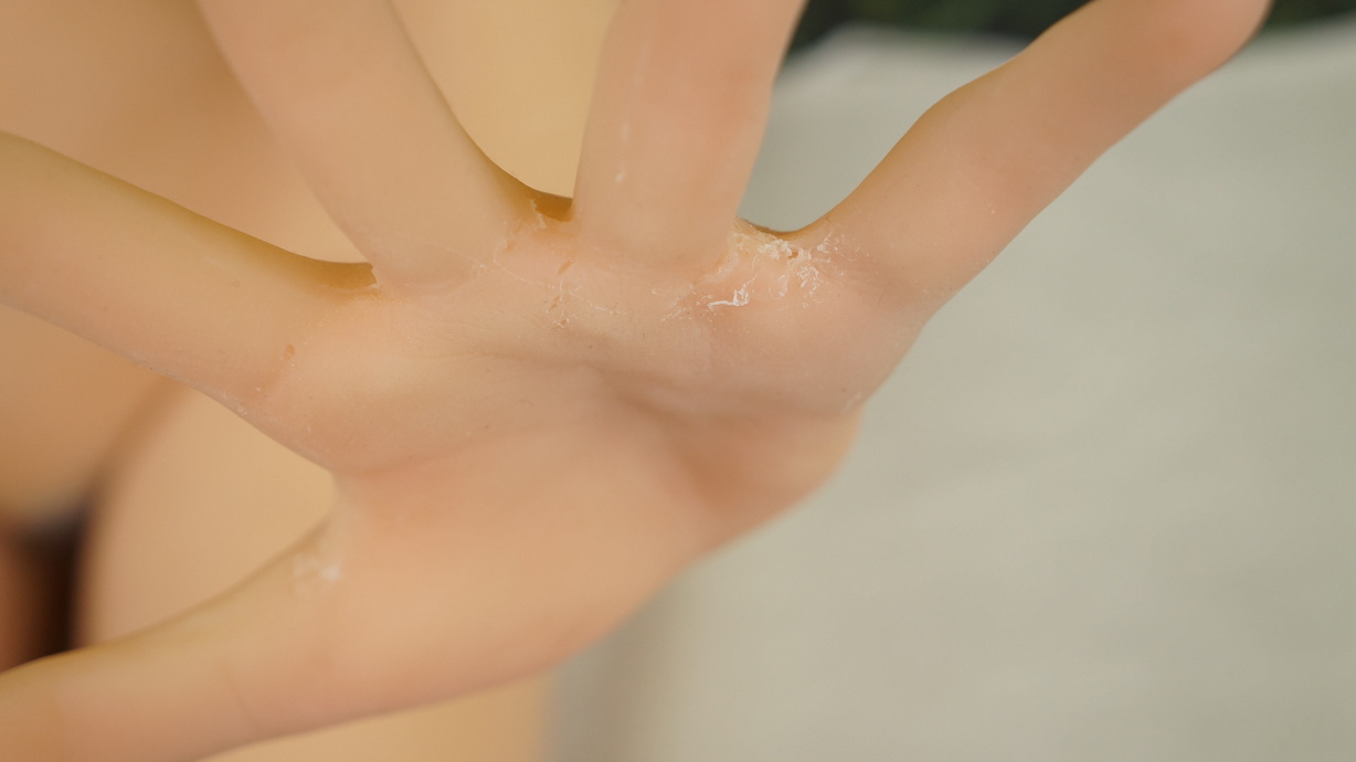 ・右手人差し指と親指付け根に亀裂(補修済み)-