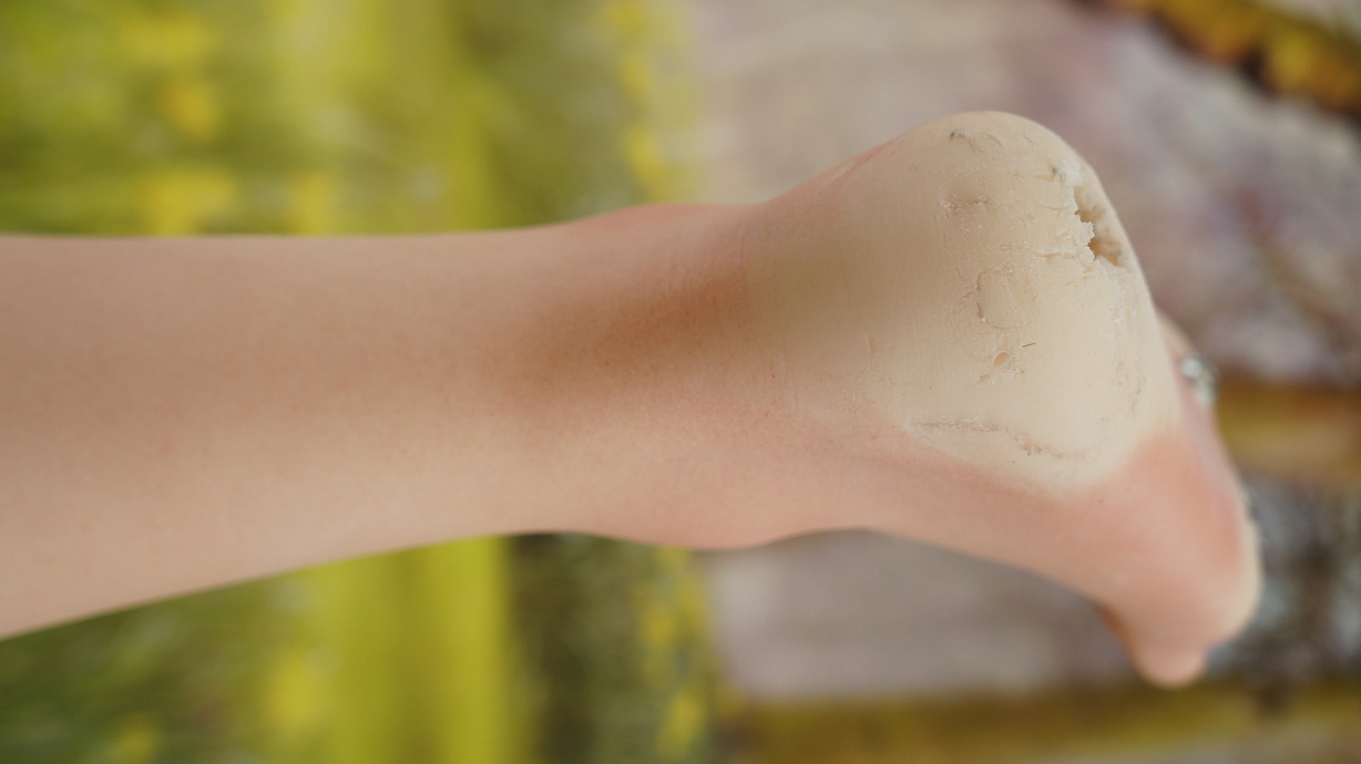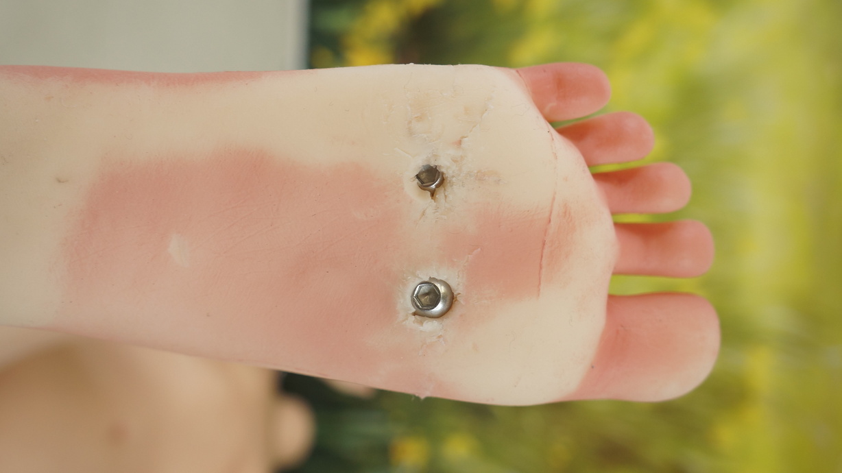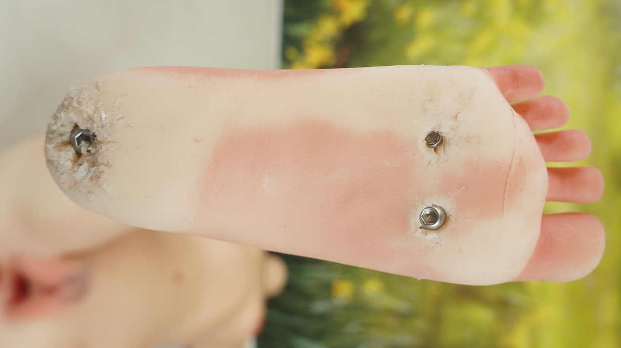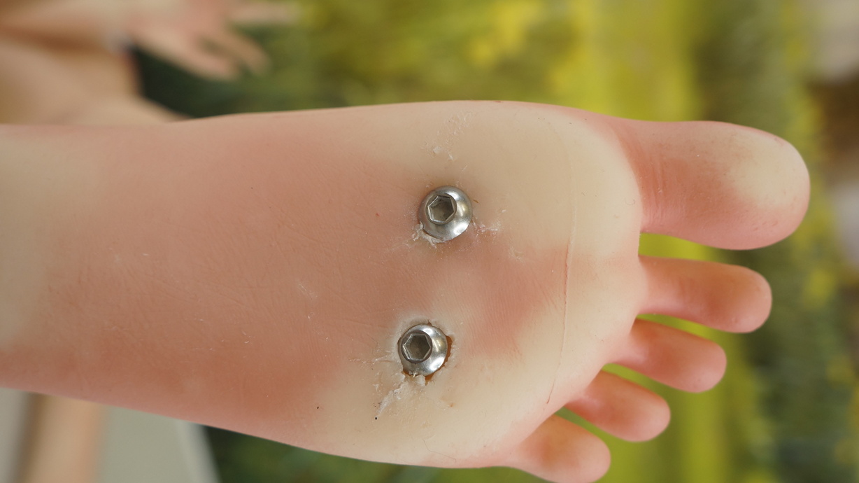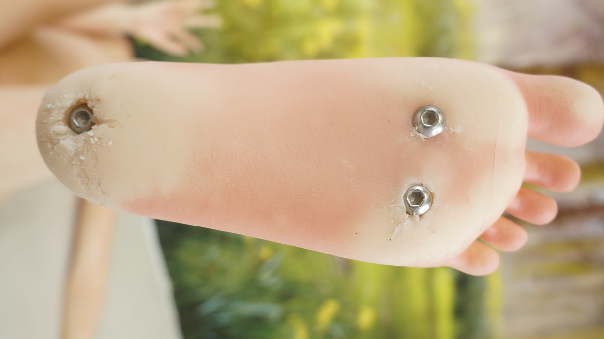 ・両足裏と両かかとに亀裂(補修済み)と塗装薄れ-