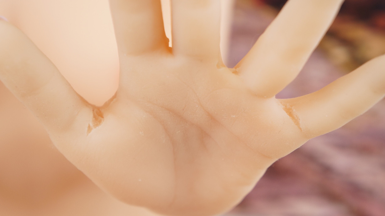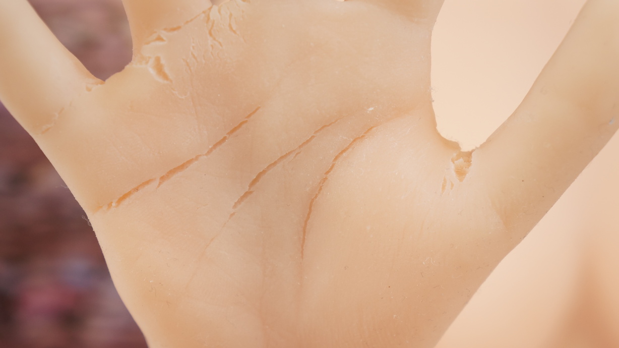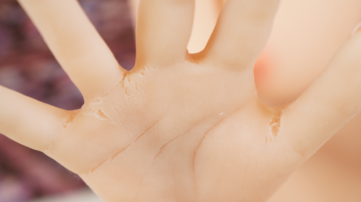 ・両手の平に網目状の亀裂-