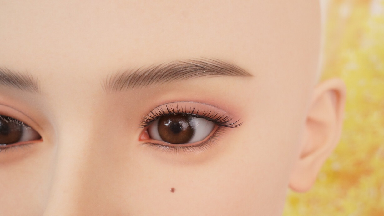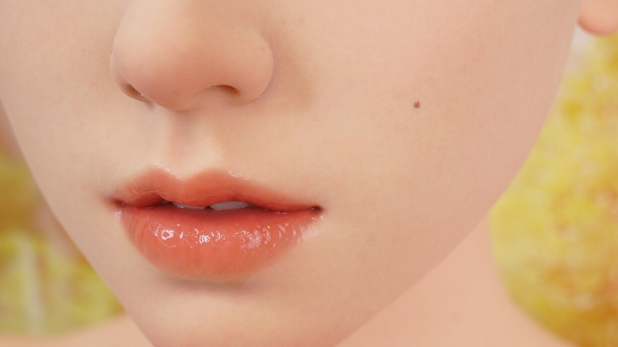 ナチュラル肌にリアルメイクを施し、血色感や陰影を再現。ほくろがアクセントとなり、リアルで魅力的な表情を演出します。